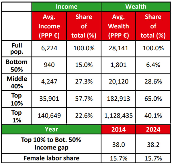 – शीर्ष 10 प्रतिशत आय अर्जित करने वालों के पास राष्ट्रीय आय का 58 प्रतिशत हिस्सा है, जबकि निचले 50 प्रतिशत लोगों को केवल 15 प्रतिशत प्राप्त होता है।