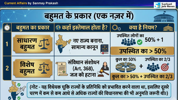 – साधारण बहुमत : नए राज्य बनाना, सामान्य कानून : उपस्थित लोगों का 50% + 1