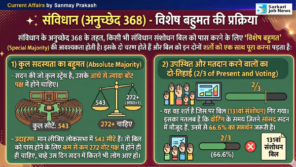 – संविधान के अनुच्छेद 368 के तहत, किसी भी संविधान संशोधन बिल को पास करने के लिए ‘विशेष बहुमत’ (Special Majority) की आवश्यकता होती है। इसके दो चरण होते हैं और बिल को इन दोनों शर्तों को एक साथ पूरा करना पड़ता है: