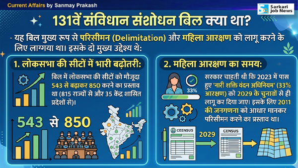– 131वां संशोधन बिल (2026): यह बिल उस परिसीमन को करने के लिए लाया गया था। इसने प्रस्ताव दिया कि लोकसभा की सीटें 543 से बढ़ाकर 850 कर दी जाएं। सरकार का तर्क था कि जब सीटें बढ़ेंगी, तभी पुरुषों की सीटें घटाए बिना महिलाओं को 33% आरक्षण देना आसान होगा। सरकार चाहती थी कि 2029 के आम चुनाव से ही महिला आरक्षण लागू हो जाए। इसके लिए उन्होंने 2011 की पुरानी जनगणना को ही आधार मानकर परिसीमन करने की कोशिश की थी, जिसे विपक्ष ने ‘असंवैधानिक’ बताया।