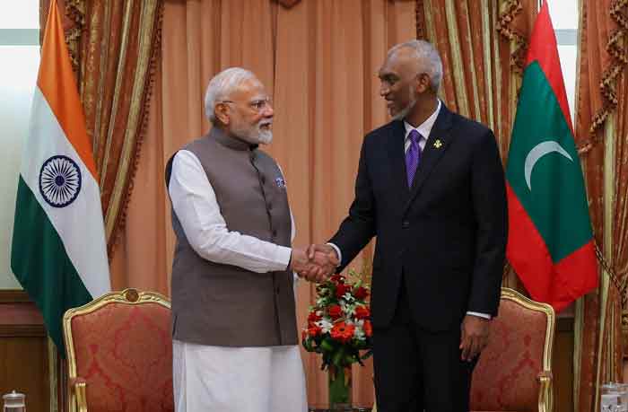 – 2023 में मुइज्जू ने ‘इंडिया आउट’ नारे के साथ चुनाव जीता था, लेकिन दिसंबर 2023 में दुबई में UN कॉप-28 सम्मेलन में पीएम मोदी और मुइज्जू की मुलाकात ने रिश्तों में सुधार की शुरुआत की। दोनों नेताओं ने आर्थिक साझेदारी और लोगों के बीच संपर्क बढ़ाने पर सहमति जताई।