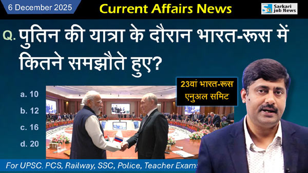 यह 6 December 2025 का करेंट अफेयर्स है। सरकारी नौकरी के लिए होने वाली प्रतियोगिता परीक्षा की बेहतर तैयारी के लिए डेली करेंट अफेयर्स के सवाल-जवाब यहां बता रहे हैं।